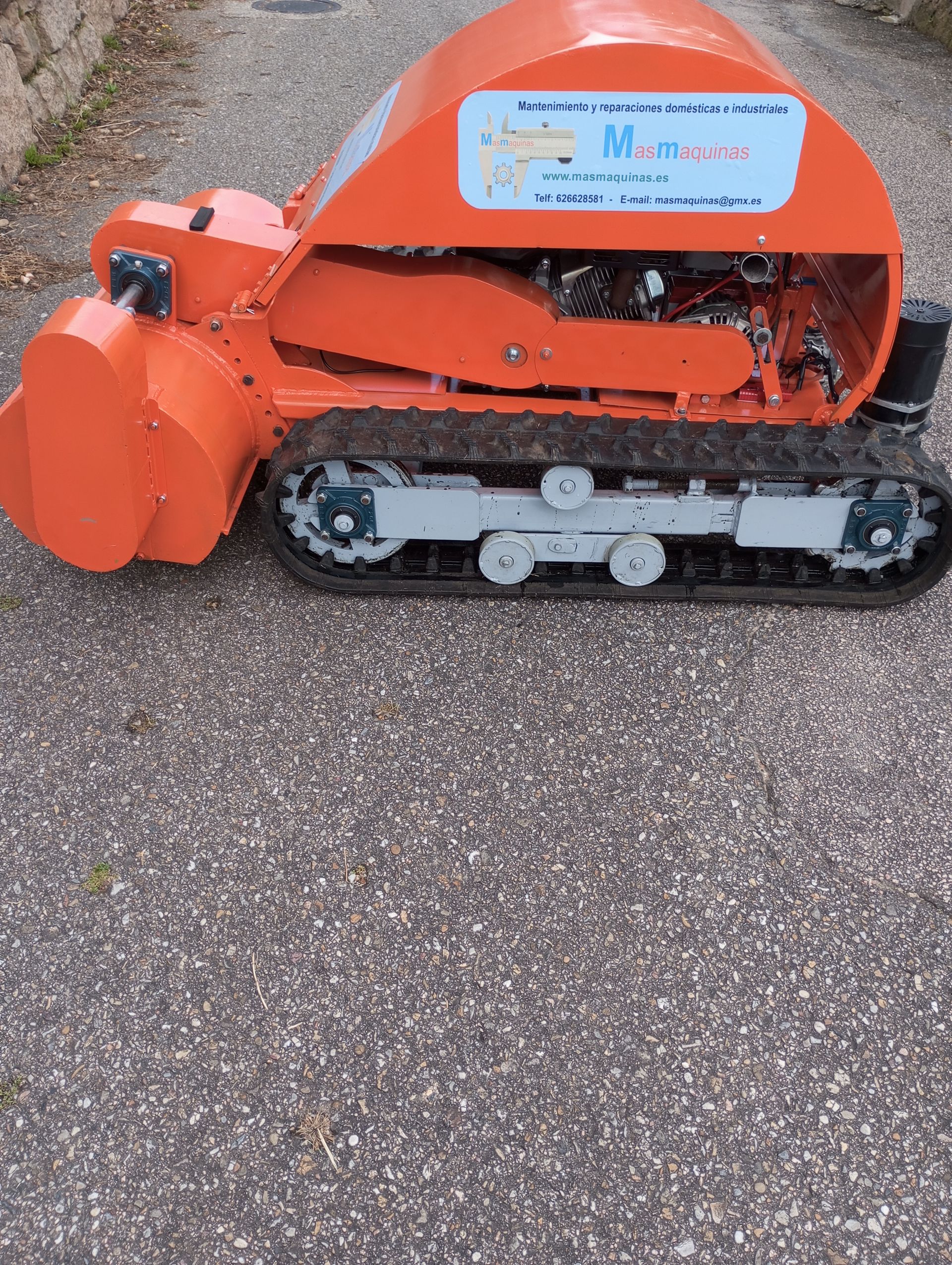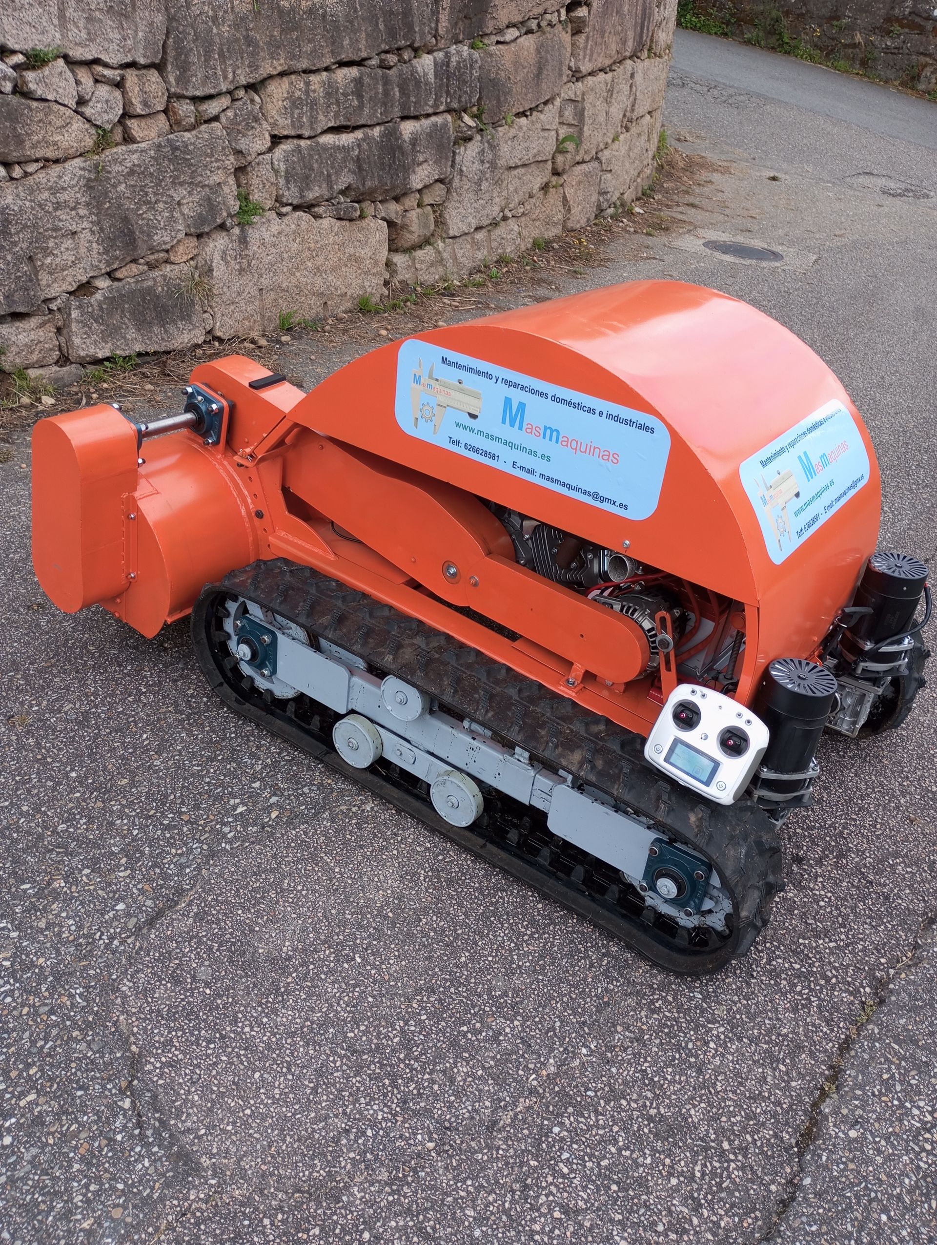 Desbrozadora de martillos teledirigida por radio control , con un ancho de corte de 103 cm con motor de combustión a gasolina para sistema de corte de maleza y motores eléctricos individuales para tracción y traslación de la maquina ,diseñada y fabricada por Masmaquinas